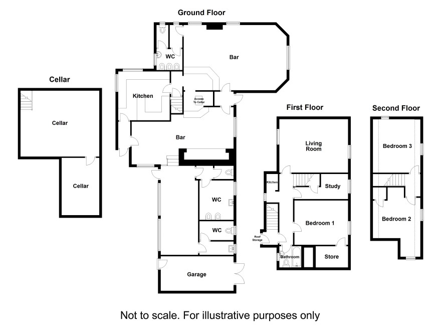 Features two bar areas, dining area, work-ready kitchen, multiple wc facilities and two cellar rooms. GROUND FLOOR Entrance hall Lounge Bar 25'7 x 16'3 Bar Area 28'8 x 10'7 Dining Area 22'2 x9'4 Kitchen 12'10 x 11'8 Cellar Room One 19'7 x 6'5 Cellar Room Two 14'3 x 9'4