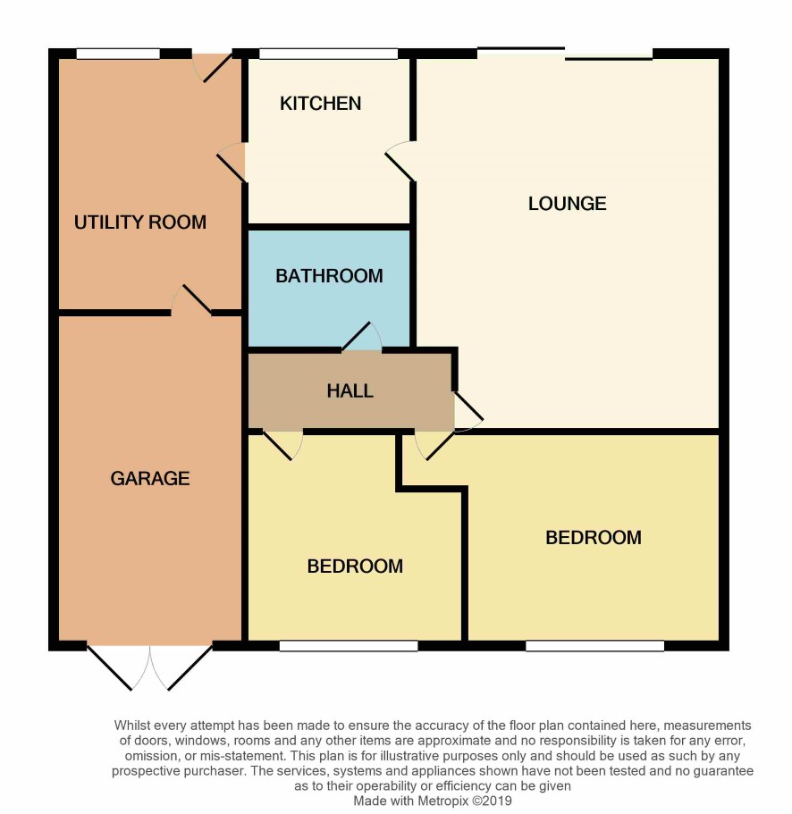 Reception Hall with access to Lounge 5.6m x 3.6m with feature fireplace and double glazed patio doors to rear Garden. Kitchen 2.4m 2.37m with range of units, window to rear and door to Utility Room 4m x 2.68m with door to outside and Garage. Bedroom 1 (front) 3.6m x 3m with double glazed window to front Bedroom 2 ( front) with double glazed window to front. Bathroom with panelled bath, wash hand basin, W.C. and window to side. Garage 4.65m 2.68m with double doors to front.