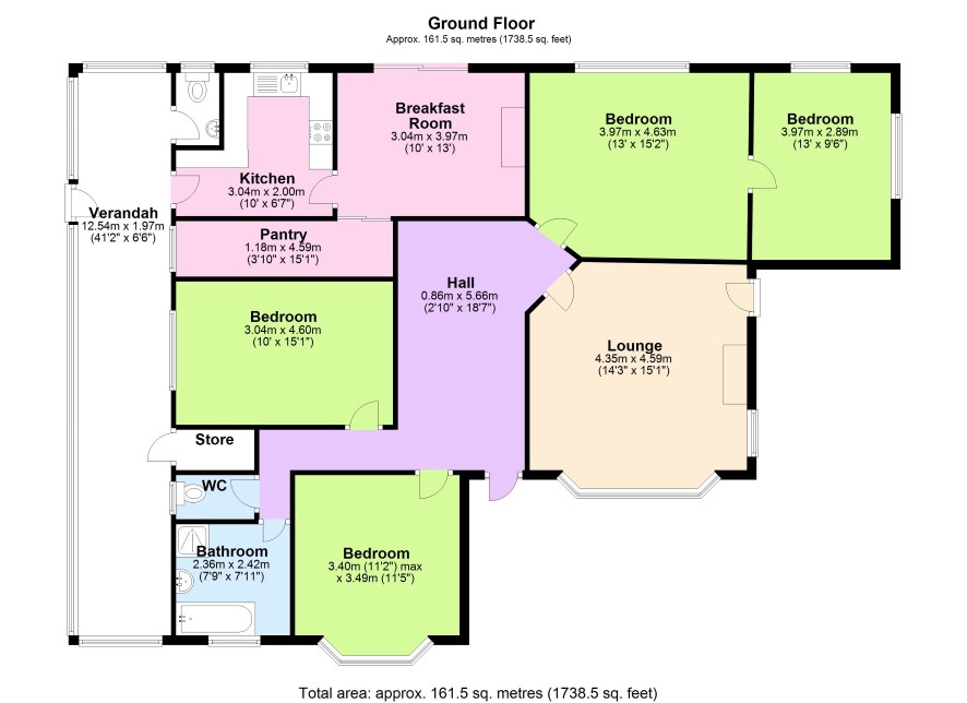 Entrance Hall, approached over steps, and off which radiates the following Lounge (4.59m x 4.35m) with bay window to front and window to side. Breakfast Room (3.97m x 3.04m) with window to rear and Access to useful Pantry. Kitchen (3.04m x 2.00m) with range of units, window to rear and door to Verandah (12.5m x 1.97) with access to W.C, and door side door to Garden. Bedroom One (rear) (3.97m x 4.63m) Bedroom Two (side) (4.60m x 3.04m) Bedroom Three (front) (3.49m x 3.40m) with bay window to front. Bedroom Four (side) (3.97m x 2.89)