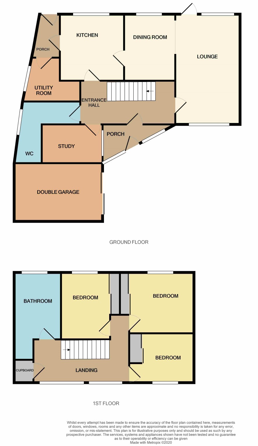 Fully Enclosed Porch, front door to Reception Hall with stairs to first floor off, access to W.C. and door leading to Through Lounge 5.8m x 3.4m with window to front, French window to rear and access to Dining Room 3.57m x 2.7m with window to rear. Door leads to Kitchen 3.8m x 3.4m with range of units, window to rear, door to Porch with access to outside and Utility Room. Off the Hallway is a Study 3.2m x 2m with window to side.