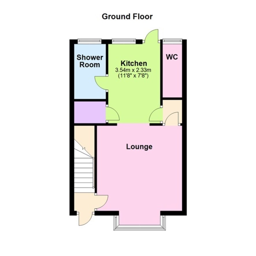 Lounge 3.6m x 4.7m, Kitchen 3.1m x 2m, Shower Room 1.6m x 1.8m and W.C.