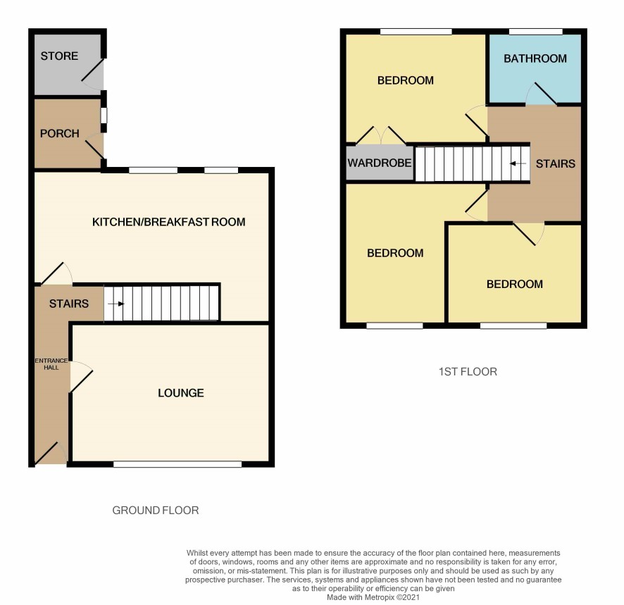 Front door leads to Reception Hall with stairs to first floor off and access to Lounge 4.8m x 2.8m, Breakfast Kitchen 5.8m x 2.7m with range of units and door to Lobby with gas central heating boiler (not tested) and door to outside.