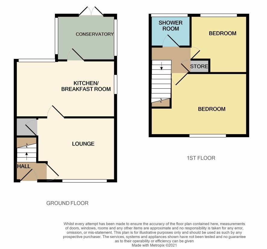 Landing leads to Bedroom One (front) 4.9m max x 3.2m, Bedroom Two (rear) 3.46m x 3m, Shower Room has matching white suite and tiled shower cubicle.
