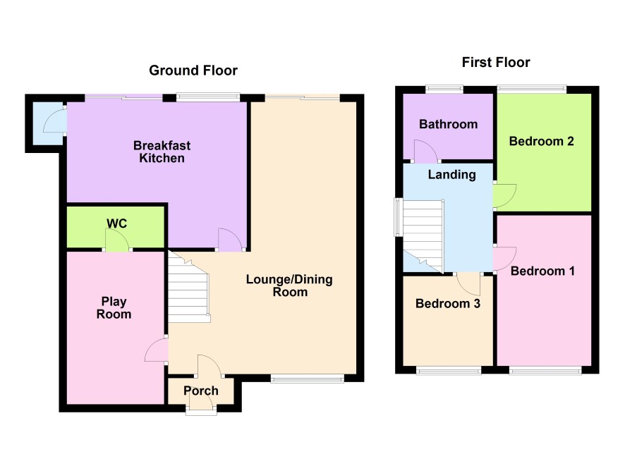 Fully Enclosed Porch with front door leading to Open Plan Lounge/Dining Room with laminate floor covering, stairs to first floor off, double glazed patio doors to rear and door to Play Room 3.94m x 2.48m, door to W.C. Extended Breakfast Kitchen 4.65m max x 2.38m having inset sink unit with drainer, base units, incorporating gas hob and electric oven with extractor fan over. Further base and wall units with breakfast bar. Double glazed patio door leads to rear garden and a further door leads to cupboard with plumbing for washing machine,