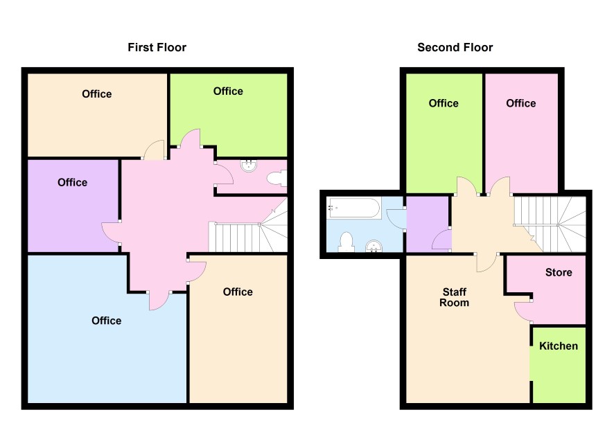 Landing having door leading to bathroom and doors off to Office 1 – 3.2m x 5.65m ( 18m2 ) Office 2 – 3.2m x 5.65m ( 18m2 ) Staff Room – 4.95m x 5.25m ( 26m2 ) with access to utility and store room