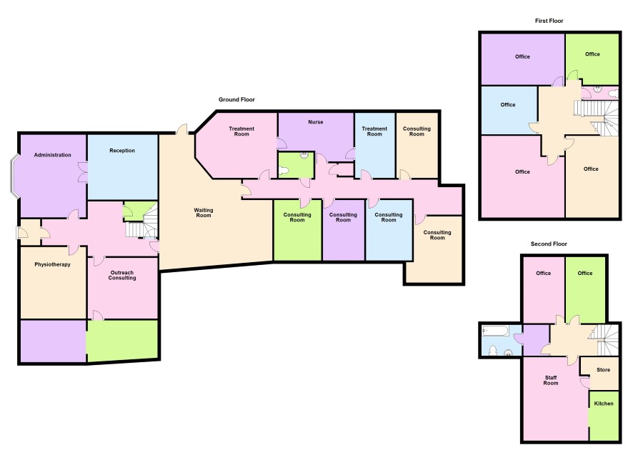 Lobby leading to Waiting Room – 26.9 m2 Reception/ Records – 18.9 m2 Administration – 29.1 m2 Lobby with stairs off to first floor landing and doors off to Physiotherapy/Chiropody – 5.7m x 4.8m (27.4 m2) Outreach Consulting – 5.2m x 4.4m (22.9 m2 ) Toilet Hallway leading to Lean to having separate reception, WC and consultation room. Hallway having doors off to General purpose room – 4.25m x 2.9m (12.3 m2 ) Consulting room 1 – 4.25m x 3.2m (13.6 m2 ) Consulting room 2 – 4.25m x 3.2m (13.6 m2 ) Consulting room trainee/3 – 19.2 m2 Consulting room 4 – 4.3m x 3.3m (13.3 m2 ) Treatment room 1 – (16.5 m2 ) Treatment room 2 – 4.3m x 3.3m (13.3 m2 ) Disabled W.C – 1.525m x 2.025m (3.1 m2 ) Store Nurse room - (14.2 m2 )