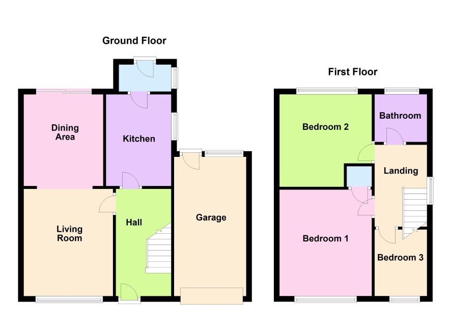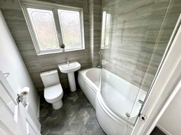 Staircase leads to Landing leading to Bedroom One (front) 3.86m x 3m, Bedroom Two (rear) 3.4m x 3.2m, Bedroom Three (front) 3m x 2.3m, Bathroom with matching white suite with shower attachment and double glazed window to rear.
