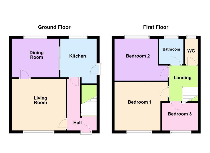 Bedroom One (front) 3.6m x 3.1m, Bedroom Two (rear) 3.7m x 2.8m, Bedroom Three (front) 2.5m x 2.3m, Bathroom and Separate W.C.