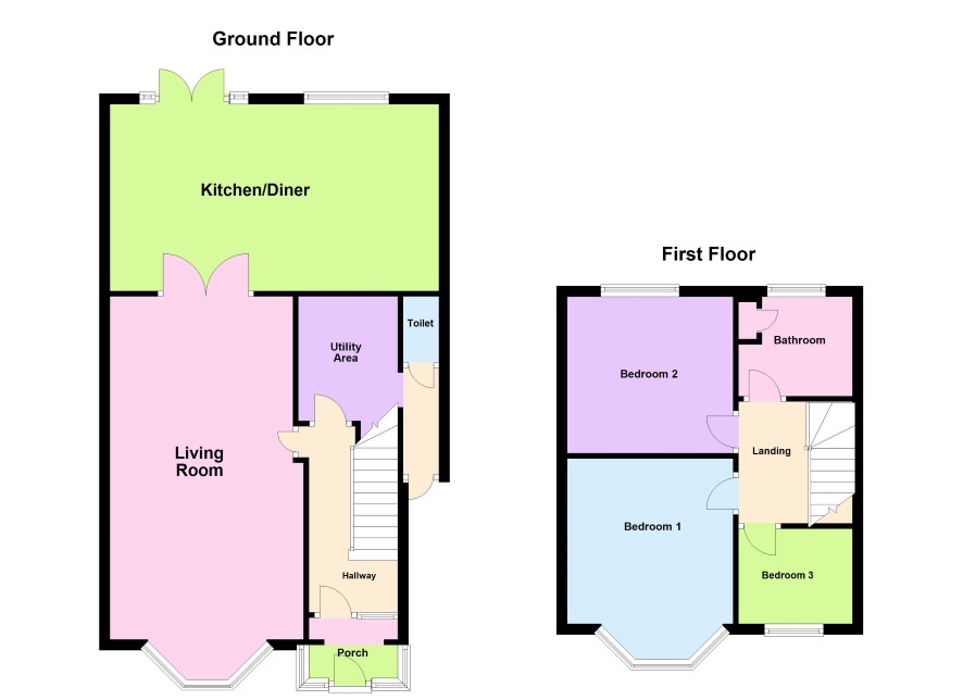 Front door leads to Porch (1.90m x 1.35m), which flows through to Hallway (1.65m x 3.50m), that in turn, provides access to Living Room (3.45m x 7.00m) that possesses double doors that lead to Kitchen/Diner (6.15m x 3.35m). Hallway also gives access to Utility Area (1.75m x 2.70m), which in turn, gives entry to downstairs WC (0.90m x 1.40m).