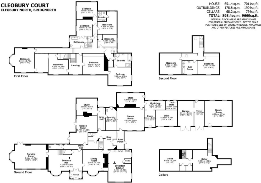 Cleobury Court is a substantial property with a wealth of beautiful character features and spacious rooms. Overall, there is approximately 9669 Sqft with 7011 in the main house, 1924 in the outbuildings and 734 in the cellars, the whole set on a plot that approaches 2.5 acres. . In its current layout, there are ten bedrooms over the first and second floors with a number of reception rooms on the ground floor. Attached to the main house, there are a range of barns which would appear to hold significant potential for conversion. Subject to the necessary consents, we believe the property could hold huge potential for a variety of different end uses and would invite all potential buyers to view with us by appointment. Not forgetting of course that Cleobury Court makes for an extremely impressive and substantial single dwelling. Please note that the barns are attached to the main house.