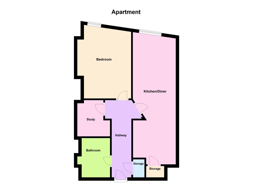 Front Door leads to Hallway, giving access to Bathroom (1.70m x 2.40m), Study (2.00m x 2.20m), Bedroom (2.95m x 4.50m) and Kitchen/Diner (3.00m x 7.75m) with storage cupboard