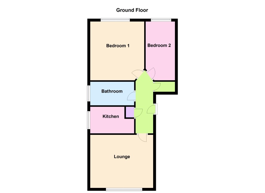 Communal Hallway, front door leads to Entrance Hall with store cupboard. Lounge 4.5m x 3.8m leading into open plan Kitchen 1.9m x 3.1 max. Bedroom 1 3.6m x 2.8m Bedroom 2 4.3m x 2m Bathroom with matching suite.