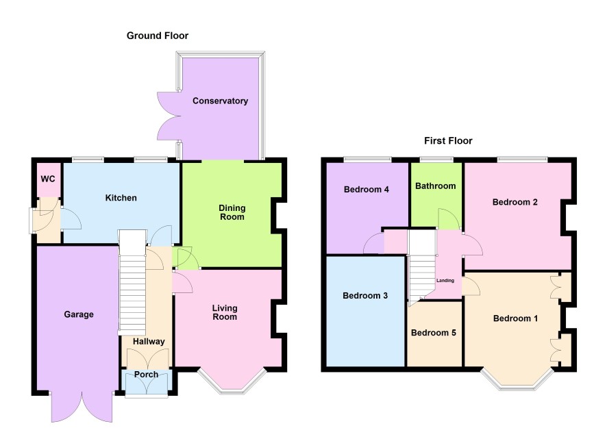 First Floor Landing gives access to Bedroom 1 (4.33m x 3.53m), Bedroom 2 (3.86m x 3.93m), Bedroom 3 (3.88m x 2.91m), Bedroom 4 (3.51m x 2.92m), Bedroom 5 (2.36m x 1.99m), and Bathroom (2.34m x 1.87m).
