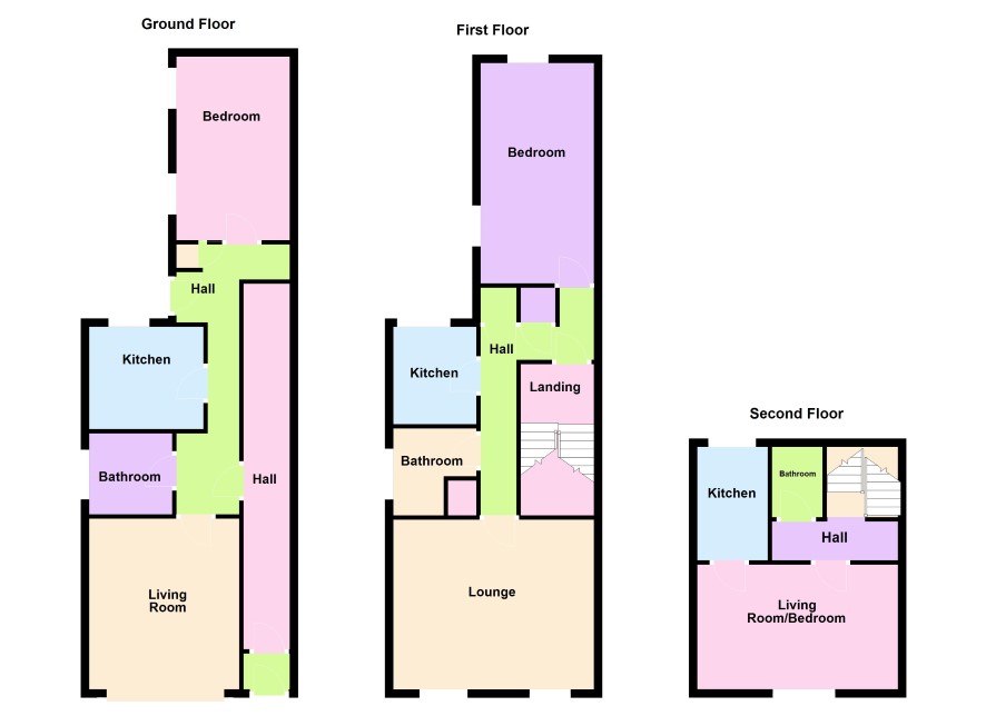 Lounge 3.7m x 4.2m, Kitchen 3.2m x 2.5m, Bedroom 4.5m x 2.7m, Bathroom. Stairs lead from the entrance hall and provide access to