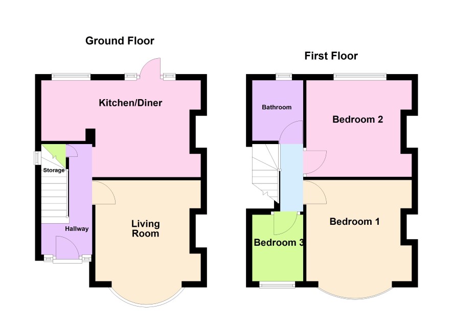 Staircase leading up from Hallway connects to First Floor Landing, giving access to Bedroom 1 (4.22m x 3.33m), Bedroom 2 (3.19m x 3.46m), Bedroom 3 (2.21m x 1.84m) and Bathroom (2.11m x 1.62m)