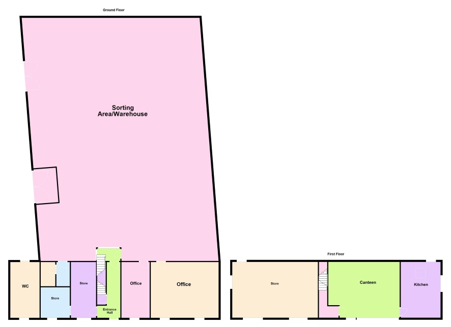 Entrance with door to cellar and access to Store Room 2.6m x 5.6m Further Store Room 3m x 2.4m Reception Area 2.9m x 5.6m Office 7m x 5.6m Sorting Office max of 25m x 18m with two sets of double door access to Loading Bay. Staircase leads to