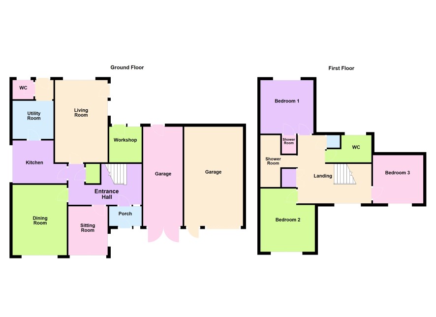 Front Door leads to Fully Enclosed Porch with door to Entrance Hall with stairs to first floor off and access to Sitting Room 3.3m x 2.7m, Dining Room 4.3m x 3.7m, Lounge 5.7m x 3.6m with French door to rear garden. Kitchen 3.7m x 3.3m max, Utility Room 2.6m x 2.8m, W.C.