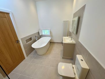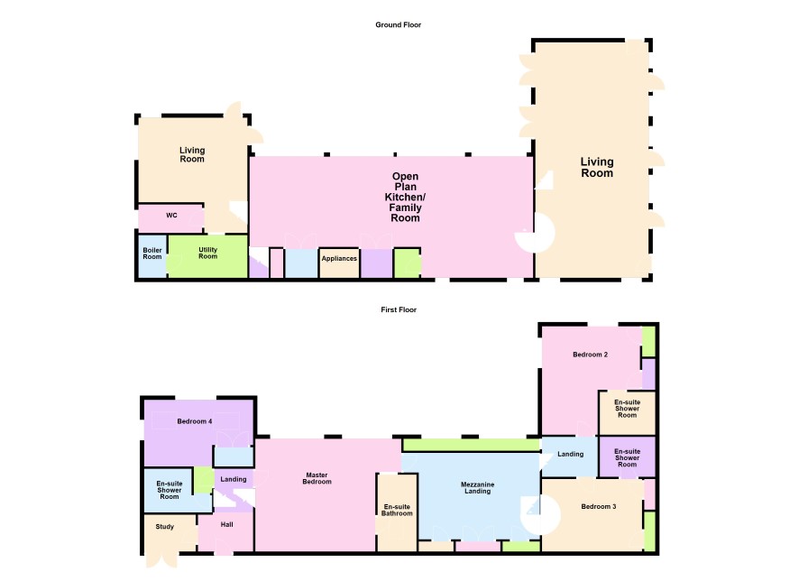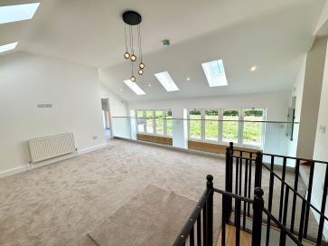 Accessed via two staircases, the upper floor features a mezzanine gallery landing with a glazed balustrade, rear-facing windows, built-in storage, and a discreet coffee station with sink and worktop. Master Bedroom (22'3" max x 20'8" into wardrobe recess): Includes a concealed dressing area with fitted wardrobes and: En-suite Bathroom (12'6" x 7'8"): Luxurious suite with freestanding bath, rainfall shower, vanity unit, and dual radiators. Bedroom Two (19'1" max x 15'10" max): Juliet balcony, built-in cupboards, and: En-suite Shower Room (10'10" x 6'9"): Spacious shower, vanity basin, WC, and chrome radiator. Bedroom Three (Same size as Bedroom Two): Dual aspect windows, storage, and matching en-suite as above. Bedroom Four (17'6" max x 11'10" max): Set off a second landing, with dual aspect views, built-in storage, and: En-suite Shower Room (7'1" x 6'9"): Modern fittings with tiled splashbacks and ladder radiator.