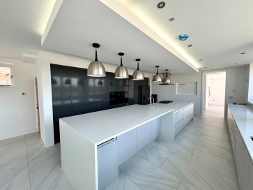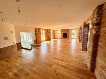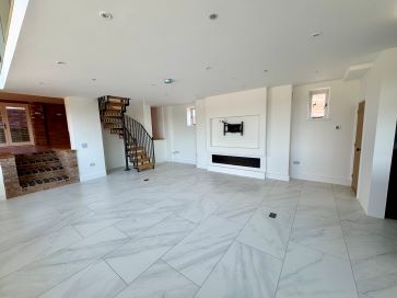 Reception Hall: A welcoming hall with a split oak staircase and access to ground and first floor rooms. Study/Snug (8'6" x 8'4"): Fitted desk and shelving, glazed doors to the front. Day Room (17'2" x 13'8"): Light-filled with windows to side and rear, French doors to outside, tiled flooring with underfloor heating. Guest Cloakroom/WC: Featuring a contemporary freestanding basin and WC, tiled splashbacks, and a window to the side. Substantial Open-Plan Kitchen/Family/Dining Room (44' max / 22' min x 19'4" max / 14'2" min): Fitted with high-gloss handleless units, granite work surfaces, a large central island, and integrated appliances including a gas hob, ovens, fridge/freezer, dishwasher, and twin pantry cupboards. Opens to the family/dining area with a feature fireplace, additional storage, and access to a mezzanine landing. Utility Room (13' x 7'1"): Co-ordinated cabinetry, granite worktop, sink, and access to the boiler room. Main Lounge (40'6" x 20'3"): A grand, light-filled living space with multiple French doors, rustic brick fireplace, inset log effect stove, and curved feature wall with lighting.