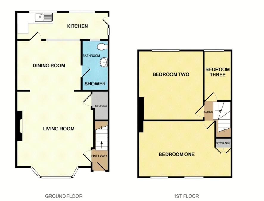 Entrance Hall central heating radiator, stairs to first floor and door into lounge Lounge 3.35m min x 4.9m approx. into bay laminate flooring, under stairs storage, double glazed bay window to front and open plan to dining room Dining Room 2.7m x 2.7m laminate floor, single glazed window to rear and door to ground floor bathroom Bathroom vinyl flooring, low level wc, wash hand basin, shower cubicle and obscure double glazed window to rear. Kitchen 4.6m x 2.1m;laminate flooring, single glazed window to rear, upvc double glazed door and window to side, base units with roll top work surface, gas hob, stainless steel sink, space for fridge freezer and plumbing for washing machine.