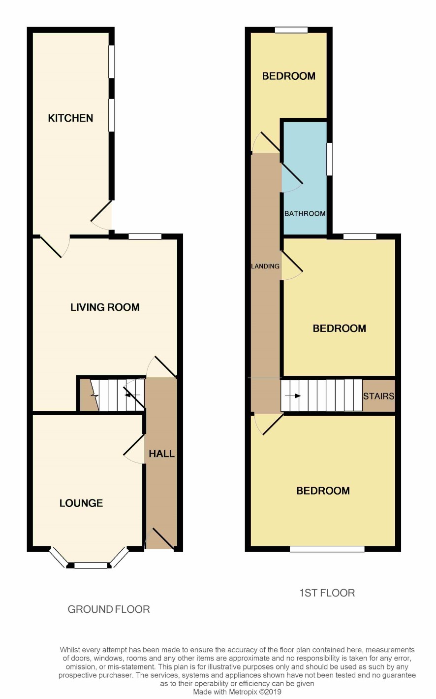 Bedroom one (front) 3.8m x 3.4m, Bedroom Two (rear) 3.5m x 2.8m, Bedroom Three (rear) 2m x 2.2m, Bathroom with white suite