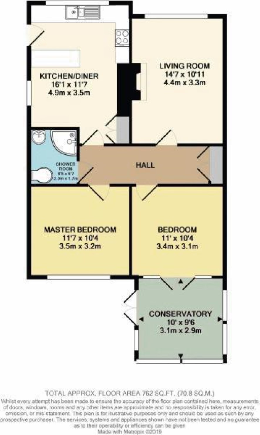 Kitchen 4.9m x 3.5m having a range of wall and floor cupboards, electric hob, oven, stainless steel insert sink, Dining Area, Inner Hall, Lounge 4.4m x 3.3m having feature fire, Bedroom One 3.4m x 3.1m with Conservatory off 3.1m x 2.9m, Bedroom Two 3.5m x 3.2m, Shower Room having shower, wc and wash hand basin.