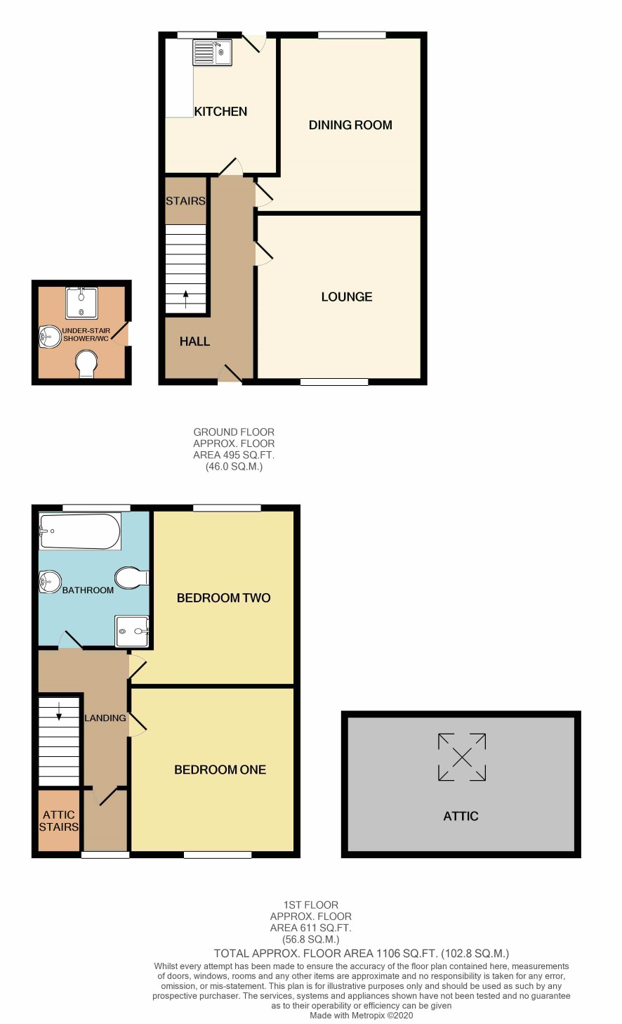 An entrance hall leads to the lounge, 3.6m x 3.6m. Dining Room, 3.5m x 4.2m (maximum overall dimensions). Kitchen, 3.0m x 2.2m, having a range of wall and floor cupboards, fitted electric cooker, space for washing machine, and stainless steel insert sink. Under-Stair Shower Room, 2.2m x 0.8m, having WC, wash hand basin and a shower.