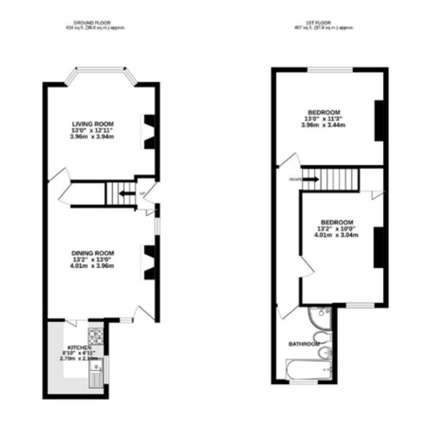 A flight of stairs leads to the first floor landing. Bedroom One, 3.96m x 3.43m. Bedroom Two, 4.01m x 3.05m, having a bi-fold door which opens to a built-in over-stair storage cupboard housing the gas boiler. Bathroom, being fully tiled and comprising of a white 4-piece suite consisting of a panelled bath, separate corner shower cubicle with mixer shower, pedestal wash hand basin, and low flush WC.