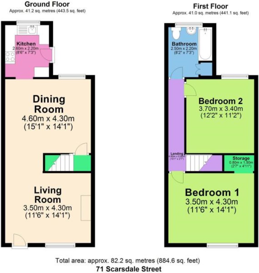 A flight of stairs leads to the first floor landing. Comprising Bedroom One, with storage area, Bedroom Two, and a Bathroom.