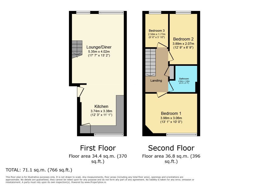 GROUND FLOOR Store cupboard Stairs leading to: FIRST FLOOR Kitchen area: 12 ft 7 in x 11 ft 4 in Lounge area: 17 ft 8 in x 13 ft 5 in SECOND FLOOR Bedroom1: 13 ft 5 in x 10 ft 3 in Bedroom 2: 13 ft 2 in x 7 ft 2 in Bedroom 3: 9 ft 1 in x 5 ft 11 in Bathroom: