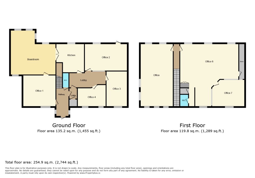 GROUND FLOOR Entrance hall: Office 1: 14 ft 5 in x 13 ft 10 in Boardroom: 20 ft x 19 ft 9 in Kitchen: 12 ft 5 in x 12 ft 8 in Office 2: 18 ft 10 in x 11 ft 11 in Office 3: 15 ft 7 in x 9 ft 2 in Office 4: 12 ft 6 in x 9 ft 6 in Cupboard: Disabled access W.C. FIRST FLOOR Office 5: 27 ft 9 in x 14 ft 6 in Office 7: 27 ft 8 in x 27 ft 8 in max Store room: 15 ft 8 in x 7 ft 4 in Office 8: 14 ft 5 in x 11 ft 10 in W.C.