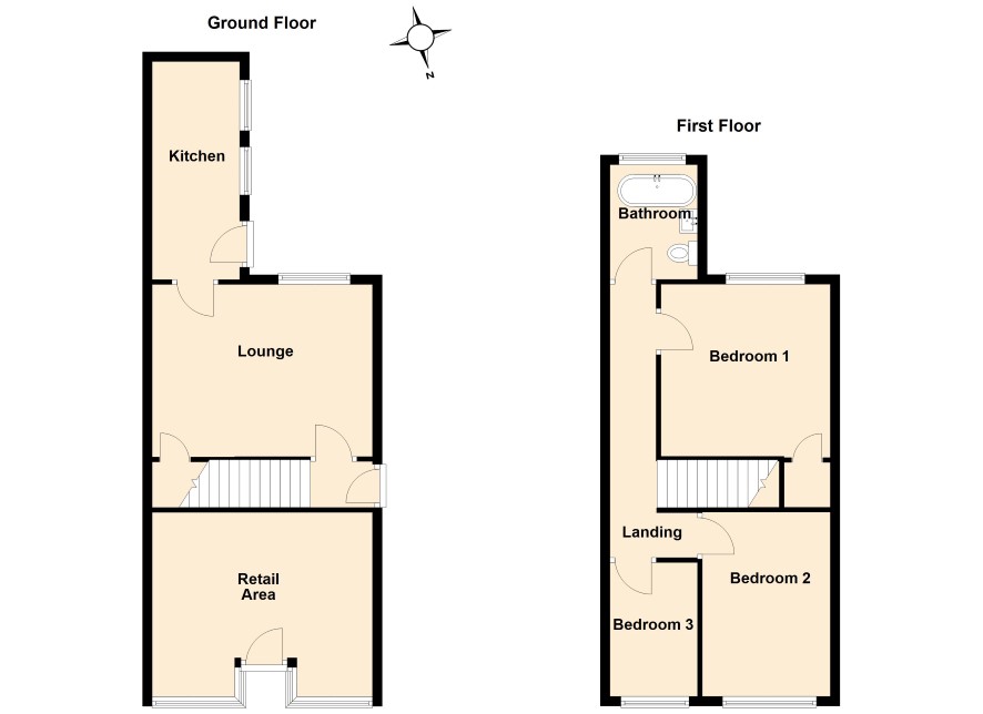 GROUND FLOOR Retail Unit (former lounge of the house) Outside W.C. Residential: Hallway Lounge: 15 ft x 12 ft max x Kitchen: 14 ft 9 in x 5 ft 11 in FIRST FLOOR Bedroom 1: 12 ft 1 in x 12 ft max Bedroom 2: 12 ft 1 in x 8 ft 8 in Bedroom 3: 9 ft x 6 ft 1 in Bathroom
