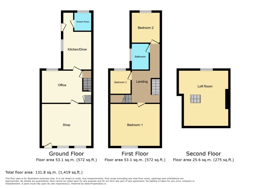 GROUND FLOOR Shop: 13 ft 8 in x 15 ft 9 in Office: 11 ft 11 in x 10 ft 6 in Kitchen: 18 ft 7 in x 8 ft Shower room: FIRST FLOOR Lounge: 13 ft 10 in x 12 ft 4 in Bedroom 1: 12 ft 2 in x 11 ft Bedroom 2: 10 ft x 7 ft 11 in Bathroom: SECOND FLOOR Loft room: