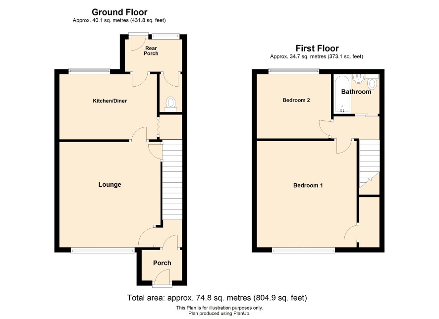 GROUND FLOOR Porch: Hallway: Lounge: 14 ft x 12 ft 1 in max Kitchen: 13 ft 2 in x 8 ft 8 in Rear porch: W.C. FIRST FLOOR Bedroom 1: 14 ft 3 in x 12 ft 11 in max Bedroom 2: 10 ft 2 in x 8 t 5 in Bathroom: