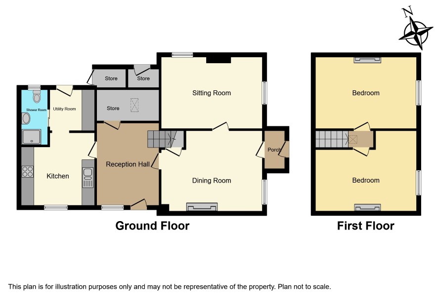Porch Living/Dining Room - 15' x 11'6 with multi fuel stove; Sitting Room/Bedroom with front and side windows; Inner Reception Hall - 12'3 x 9'6 with side outer door, stairs off and access to walk in Store; Kitchen - 11' x 10'9 with range of units, oven and hob; Utility - 6'9 x 5'3 with outer door; Shower Room - 7'9 x 3'9 with shower, basin and WC.