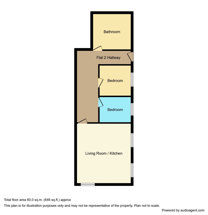 Hall; Living Room/kitchen - 16' x 11'3; Bedroom - 8'3 x 7'9; Bedroom - 7'9 x 6'9; Bathroom - 8'3 x 8'.