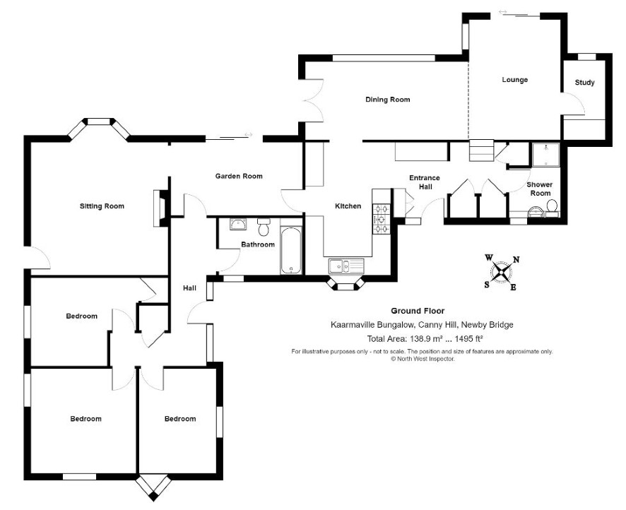 A beautifully presented detached bungalow with fabulous views, gardens and grounds situated towards the foot of Lake Windermere in the Lake District National Park. With four reception rooms, three bedrooms, two bathrooms, kitchen, study, several outbuildings and ample parking.