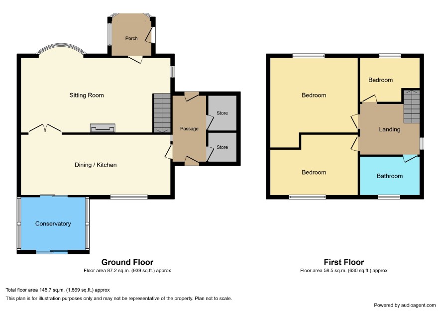 Porch Sitting Room 18'9 x 12'6 Dining Kitchen 18'9 x 9' Conservatory 7' x 6'3 Passageway leading to 2 stores and outer door