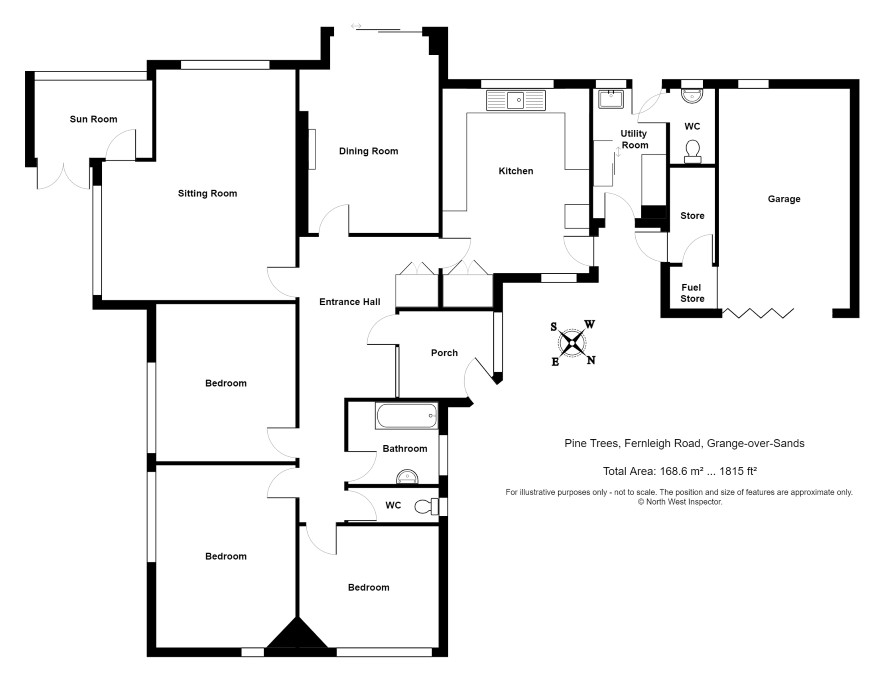 A detached three bedroom bungalow in a prime location with garden and woodland. In need of modernisation with a total floor area of circa 1815 sq ft. The site benefits from a substantial parcel of land to the rear and may have potential for further development subject to the necessary permissions. Comprises: porch, hall, 2 reception rooms, sun room, kitchen, utility room, 3 bedrooms, store and garage.
