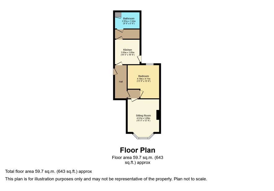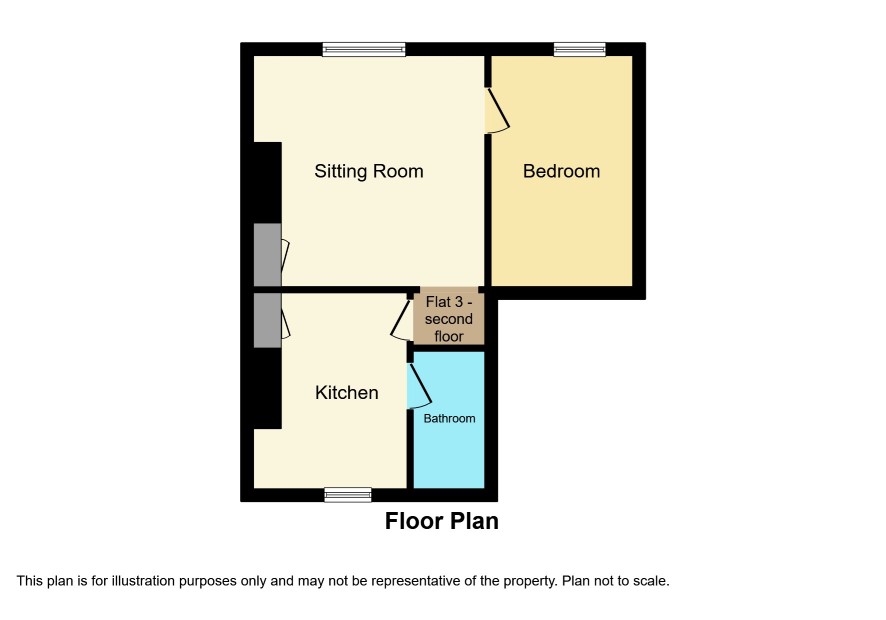 Hall; Sitting Room - 13' x 11'3; Bedroom - 13' x 8'; Kitchen - 13'9 x 6'9; Bathroom - 9'6 x 5'.