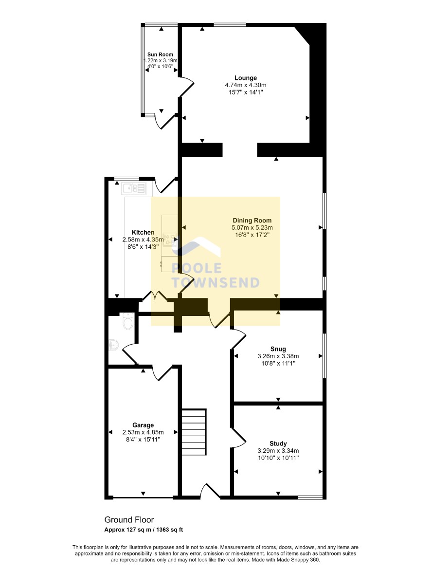 Hall with cloakroom and stairs to the first floor Reception Room/Study 10'10 x 10'11 Snug 10'8 x 11' with fireplace Dining Room 16'8 x 17'2with access to the lounge and kitchen Kitchen 8'6 x 14'3 with fitted wall and base units, door to the garden Lounge 15'7 x 14' with a brick built fireplace and door leading to: Sun Room 4 x 10'6 with access to the garden