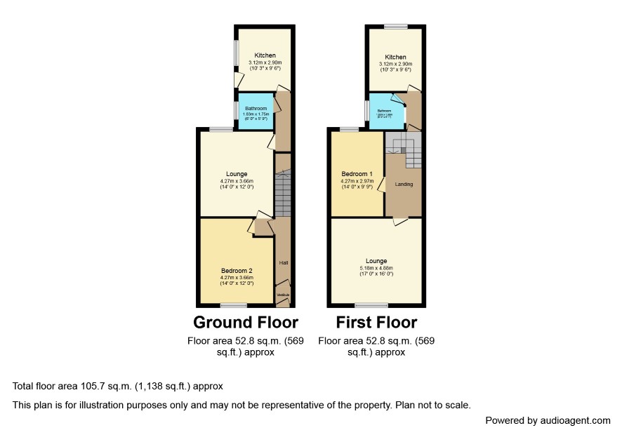 Entrance hall leads to flat entrance Lounge 14' x 12' Bedroom 14' x 12' Kitchen 10'3 x 9'6 Bathroom 6' x 5'9