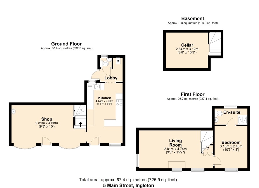 Shop 15' x 9'3 with 2 bay windows, stairs to the first floor and hatch to stairs to the Cellar Kitchen 14'7 x 8'8 with fitted wall and base units, outer door Lobby Cloakroom with WC and wash hand basin