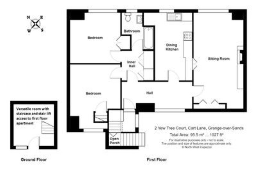 A well proportioned first floor apartment forming part of a barn conversion with views towards Morecambe Bay. The property is well located for the vast range of amenities in Grange over Sands, including Train Station and transport links. Access to the first floor is via external steps, or through a useful ground floor room with stairs and a stair lift. The first floor accommodation comprises sitting room, kitchen, hall with storage, two bedrooms and bathroom.