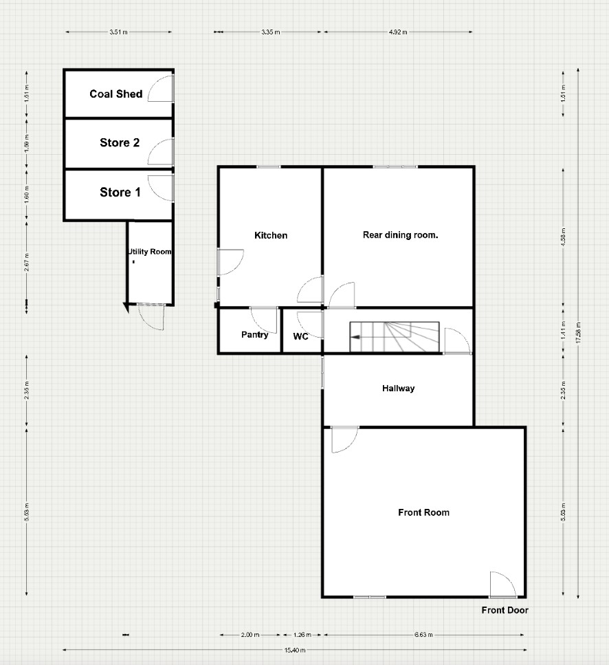 Clifton House: room dimensions. In metres (main house) Rear downstairs dining room:L: 4.95 W:5 H:3.5 Kitchen: L: 5.0 W:3.55 H:2.92 Hallway: L:3.9 W:3.7 H:3.5 Downstairs front reception/living room L:6.63 W:5.53 H:3.48 Downstairs toilet: L:1.42 W: 1.42 H2.9 Large main front Bedroom L:6.63 W:5.33 H:3.03 Back bedroom L:4.96 W:4.98 H:3 Bathroom upstairs L:4.95 W:3.49 H:2.55 First floor landing: L:4.93 W:3.92 H:2.55 Attic Landing/Shower room: L:3.9 W:3.4 H:2.57 Large Attic bedroom (left) L:4.93 W:4.98 H:2.23 Large Attic Bedrooms (right) L:6.6 W:5.36 H: 2.23 Cellar/heating utility room. L:6m W:5m H:2.3m There are also rear out buildings for storage, as well as an attached rear court, and a porch area, and exterior laundry room, to the rear of the kitchen.