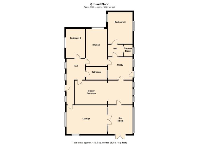 Entrance Hall; Sitting Room - 16'6 x 11'6 with front and side windows, sea views and double doors into:- Sun Room - 11'9 x 10' with French window onto patio; Kitchen - 18'6 x 8'3 with range of units; Utility Room - 10' x 8'9 with outer door and access to- Inner Hall leading to:- Bedroom 2 - 13' x 12'9 with front and rear windows; Shower Room - 6'3 x 5' with shower, basin and WC; Master Bedroom - 12'9 x 9'9 + 10'3 x 9'9; Bathroom - 8'6 x 4'9 fully tiled with bath, basin and WC; Bedroom 3 - 12' x 8 with sea views.