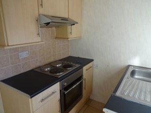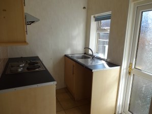 Base and wall units, electric hob and oven, stainless steel sink with mixer taps. Frosted glazed door to the rear yard area.