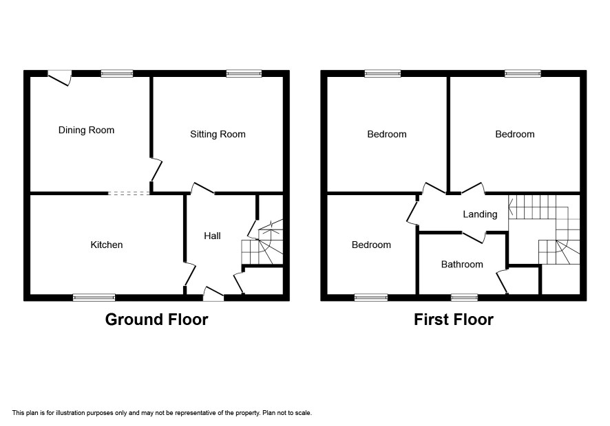 Landing; Bathroom - 6'6 x 6' with bath, basin and WC; Front Bedroom - 9'6 x 7'9; Rear Bedroom - 11'9 x 11'3; Rear Bedroom - 11'6 x 9'9.