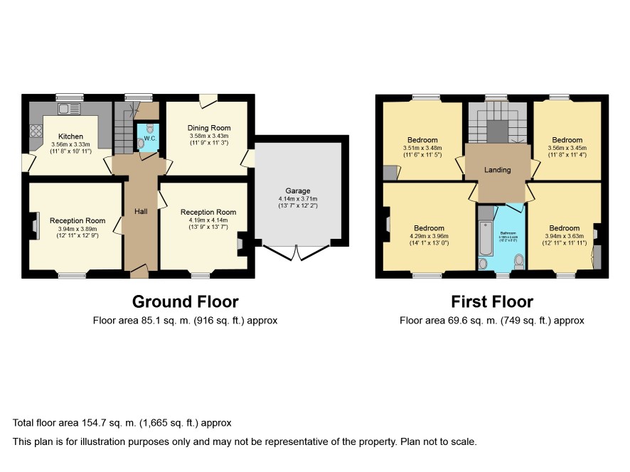 Landing; Front Bedroom - 14' x 12' with feature fireplace; Rear Bedroom - 11'6 x 11'3; Rear Bedroom - 11'9 x 11'3; Front Bedroom - 14' x 12' with alcove cupboard and drawers; Bathroom - 10'3 x 8' with bath, basin and WC.