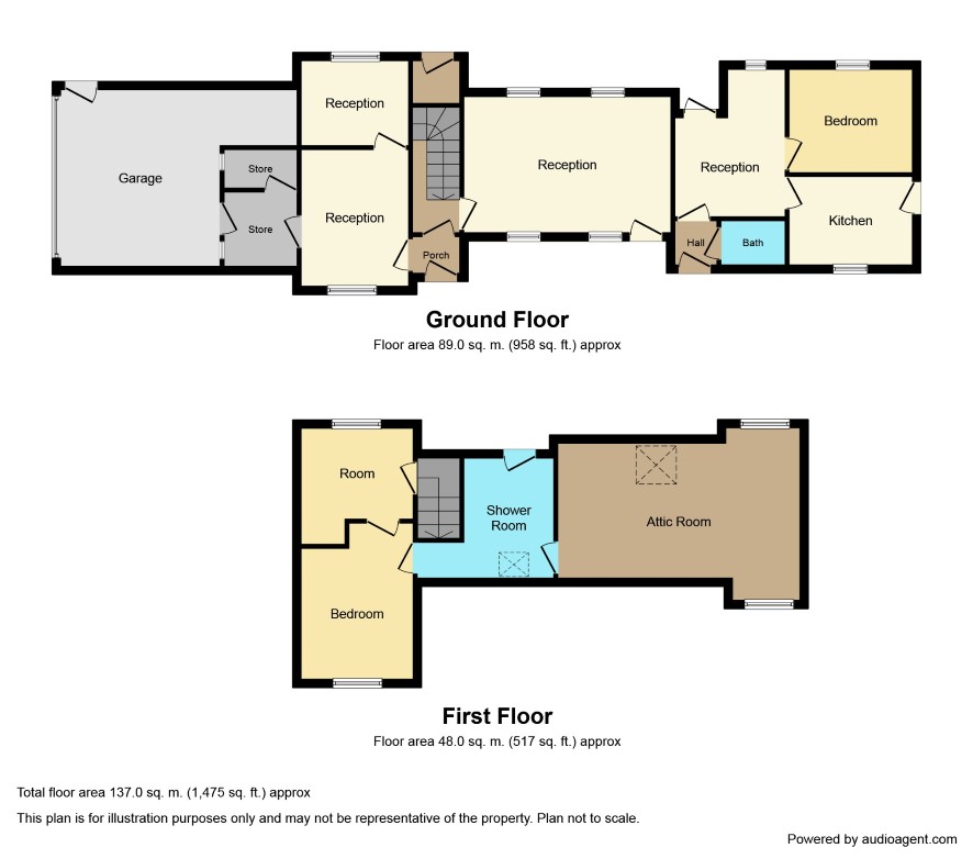 Hall; Bathroom - 8'3 x 5' with WC, basin and walk in bath; Rear Room - 16' x 11'9 max with outer door; Bedroom - 10'9 x 8'6; Kitchen - 11' x 8'6 with side outer door; Reception Room - 21'6 x 11'9; Front Room - 12' x 11'9 with separate access via Porch; Rear Room - 11'9 x 9'; Storeroom - 10' x 9' with flagged floor with access to Second Store - 8'9 x 4' and Garage - 18' x 16' overall with roller door.